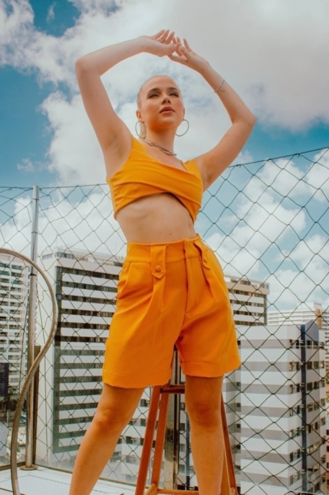 Bermuda Com Pregas e Botões Cobertos, Fechamento Frontal por Zíper e Dois Colchetes. Tecido: Crepe Alfaiataria Composição: 95% Poliéster 5% Elastano